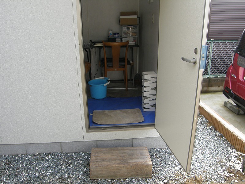 入口付近です。土足OK、白の傘立てと青のゴミ入れ用バケツがあります。