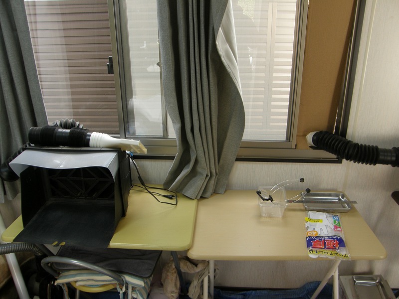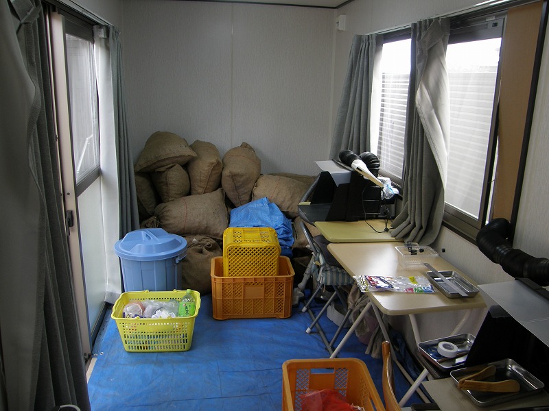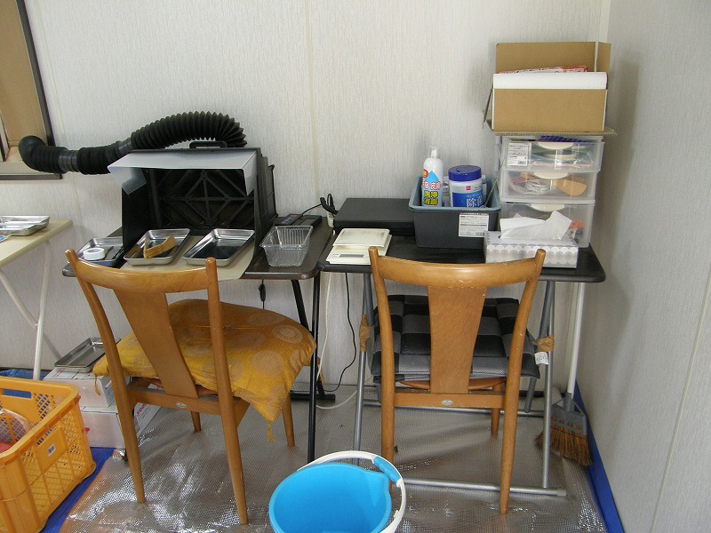 右机は用具置き場、左机は調査用です。莢は水洗いし乾燥させたものをむ剥き実しますが、それでも砂ぼこりがたちますので、排出ブースを使っています。