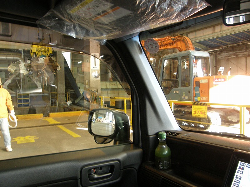 処理重機はバックホーの一種だと思いますが、よく見えません。後続車が気になって、車内から慌てて写真をとりました。