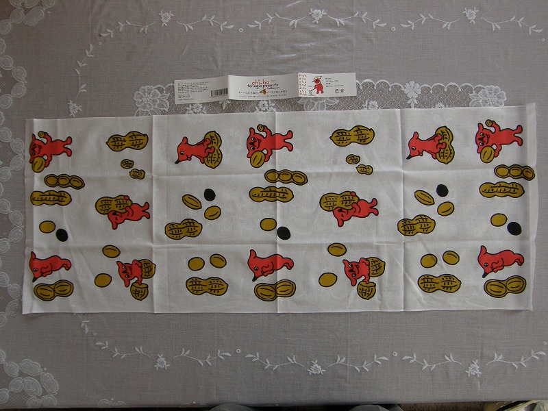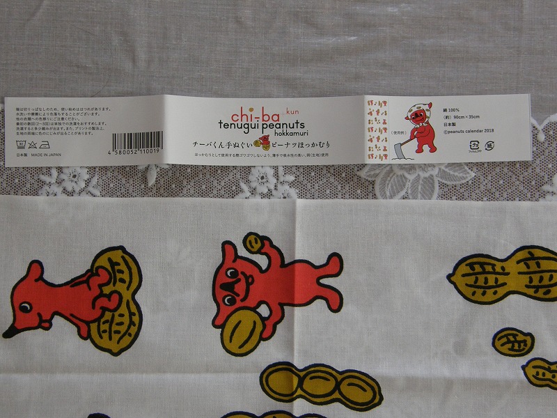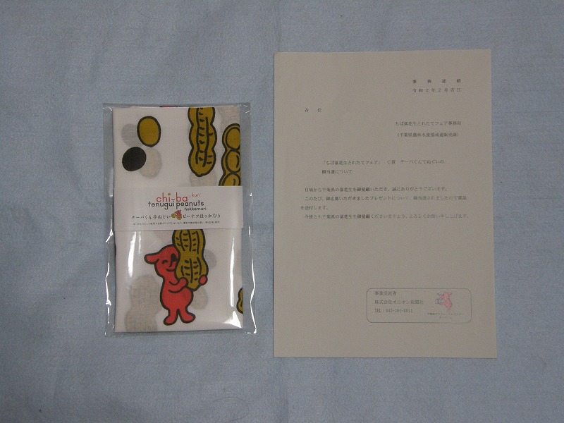 開封すると出てきました。チーバくんてぬぐい「ピーナッツほっかむり」。 「ちば落花生とれたてフェア」のC賞商品です。そういえば前に応募していました。 まさか、くじ運の悪い小生に当たるとは。47名のみの当選だそうです!?