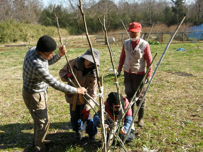 その一つとして剪定をします。整枝法(樹形)は現役の時親しんだ一文字整枝ではなく、開心自然形にしたいとのことです。ウメやモモでの一般的な剪定法ですが、イチジクは樹勢が強いので剪定時の気配りと事後観察がより必要な気がします。剪定するのは、園主さんと2人のつもりでいたら、他に3人の方がいらして、5人で行うことになりました。