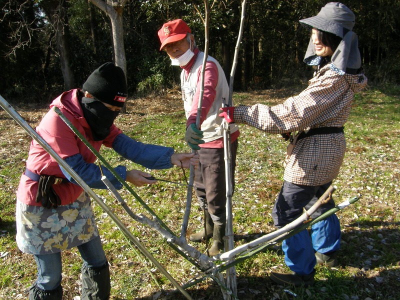 ①観光つみ取り園の場合は、脚立などは使えないので樹高を低く押さえる整枝が必要 ②光合成の確保と病害虫対策を考えて、枝はやや少なめに残し、かつそれらの空間配置が均一で重ならないようにすることが重要 と考え、皆さんに剪定位置をアドバイスします。
