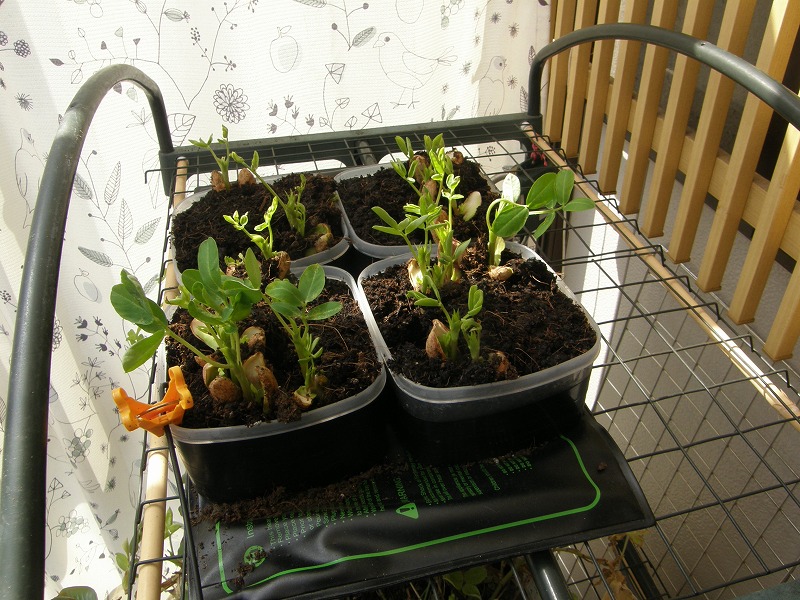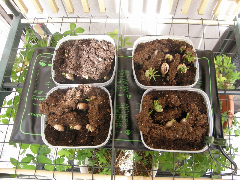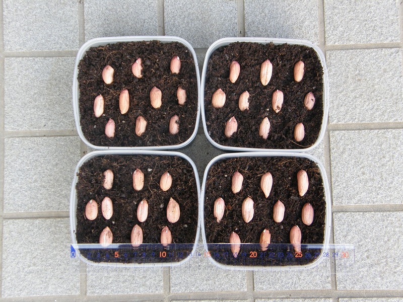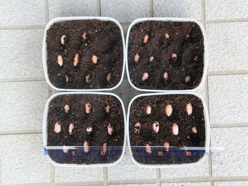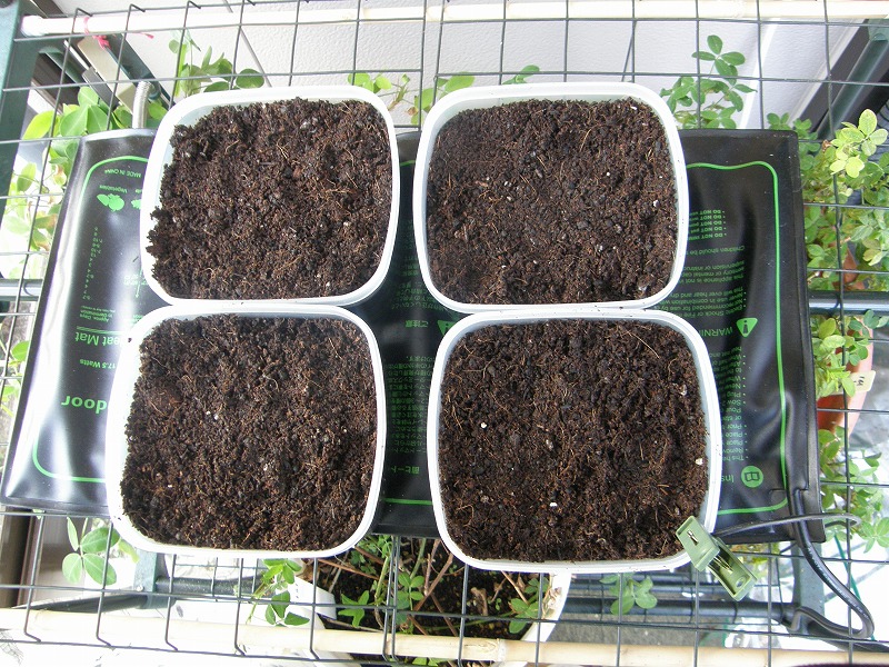小型のポリ容器を用いて、各10粒の種子、計40粒を播種します。容器の側面には十分な遮光をするため、黒のビニールテープを貼ってあります。