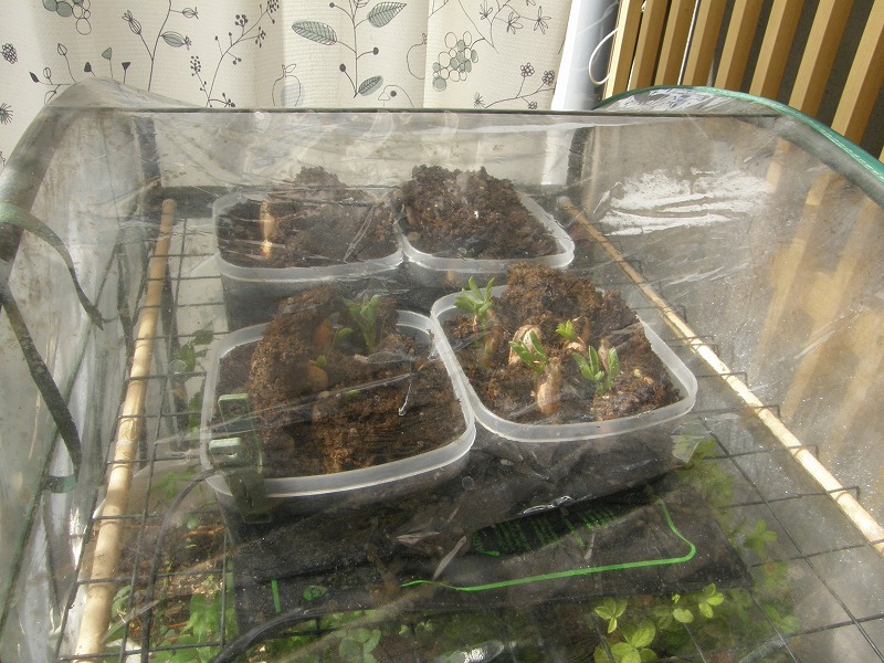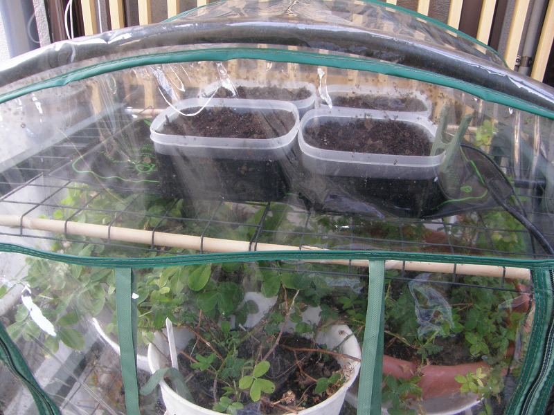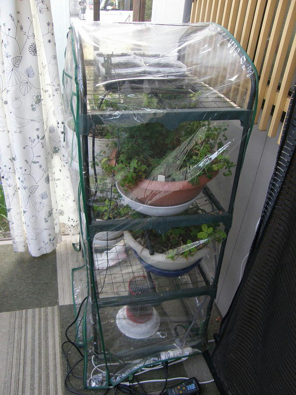 発芽試験に使っているのは、サンルームに置いてある小型ビニール温室です。下段には栄養繁殖させている野生種のポット株も同居しています。また、一番下には、ヒートマットとは別に加温用のパネルヒーター(20℃設定)も設置しています。