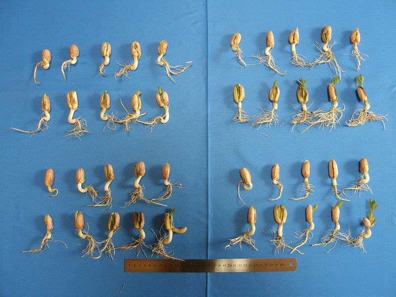 堀上げ値洗いして並べ写真を撮ります。発根率は良好です。しかし発芽していないものが多いので、もう少し調査を遅らせたほうが良いですね。ただ、子葉を押し開いて主茎や子葉節分枝の生育状況を確認したところ、正常なものが多かったので、それらを今後発芽や出芽見込みと判定しました。