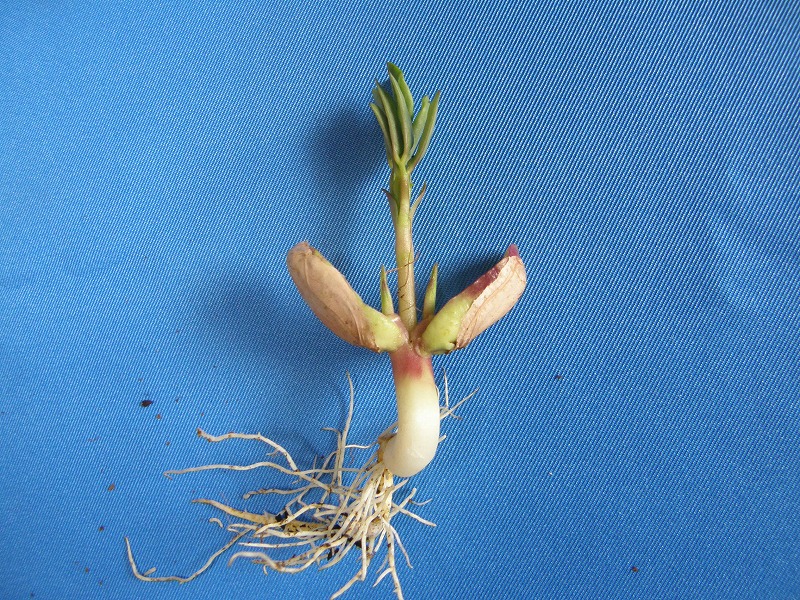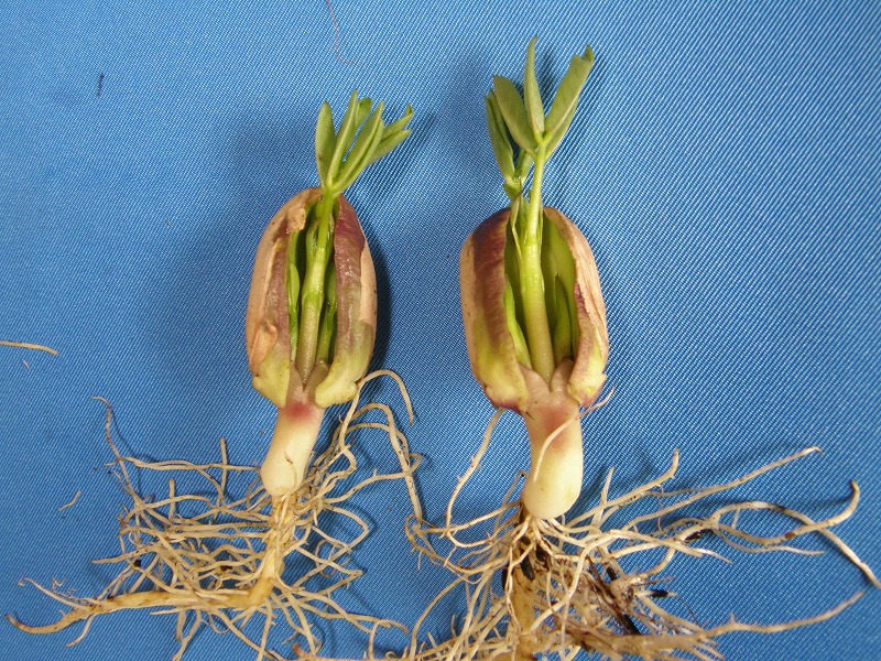子葉の展開は不十分ですが、主茎と子葉節分枝は正常に育っています。発芽試験では発芽株、圃場では間もなく地上部に出て出芽株と判定される株になります。