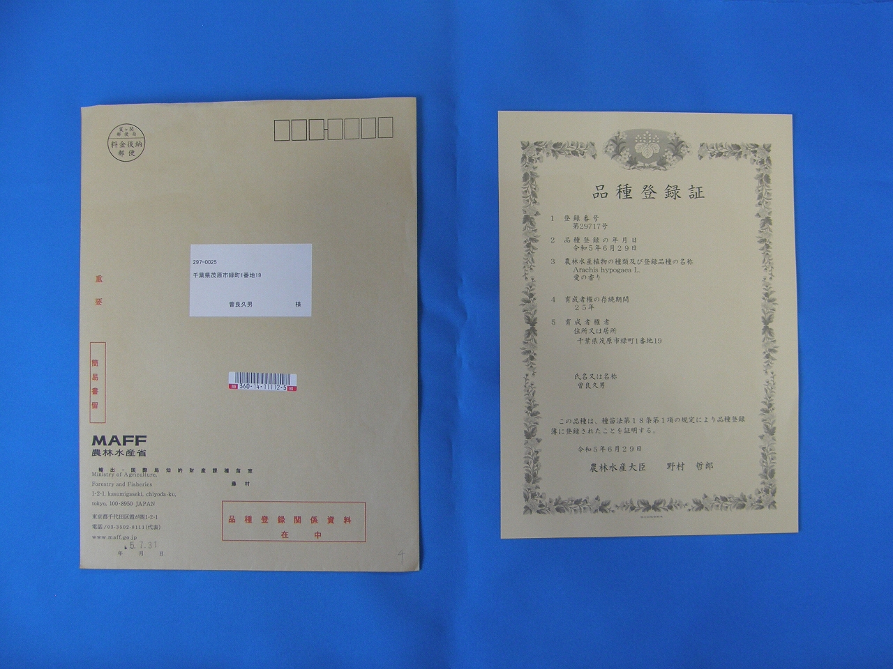 8月2日に農林水産省知的財産課種苗室から簡易書留便が届きました。品種登録関係資料在中とあります。