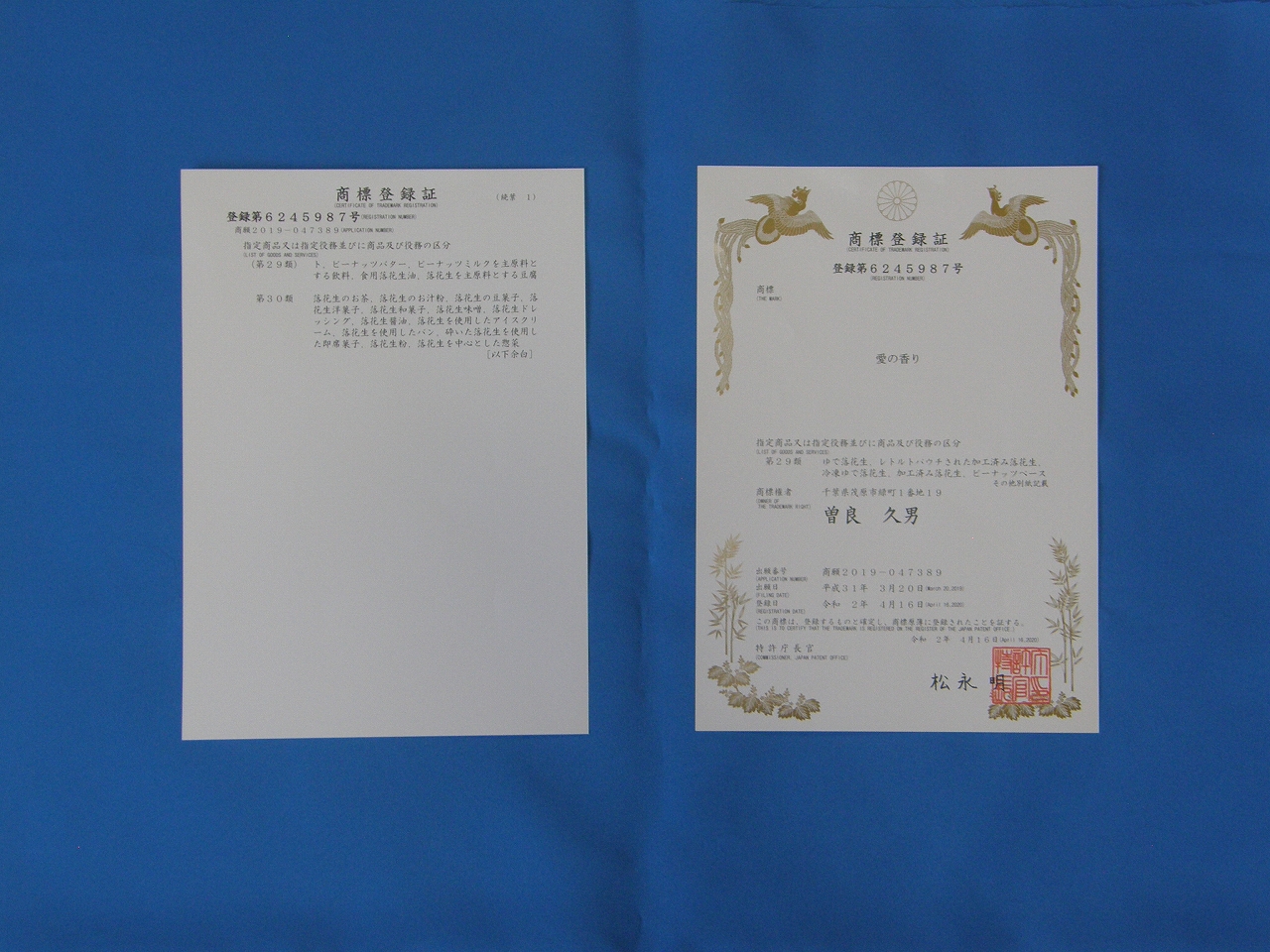 実は、「愛の香り」は商標登録もしています。登録日は令和2年(2020年)4月16日、出願日が平成31年(2019年)3月20日で出願から1年弱で登録となりました。品種登録に比べると,迅速登録されています。登録した商品(役務)区分は、第29類と第30類です。