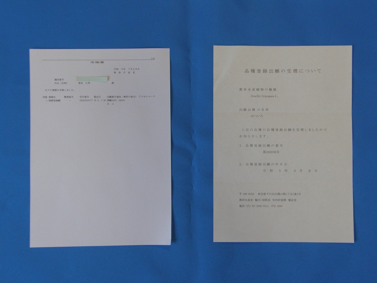 写真(右)のように「愛の香り」に続く2番目の育成品種として、「はついろ」を品種登録出願いたしました。 種皮が赤紫色の極大粒種で、詳しくは後日当HPで発表する予定です。ちなみに出願日は2023年3月8日、出願公表日は7月19日です。